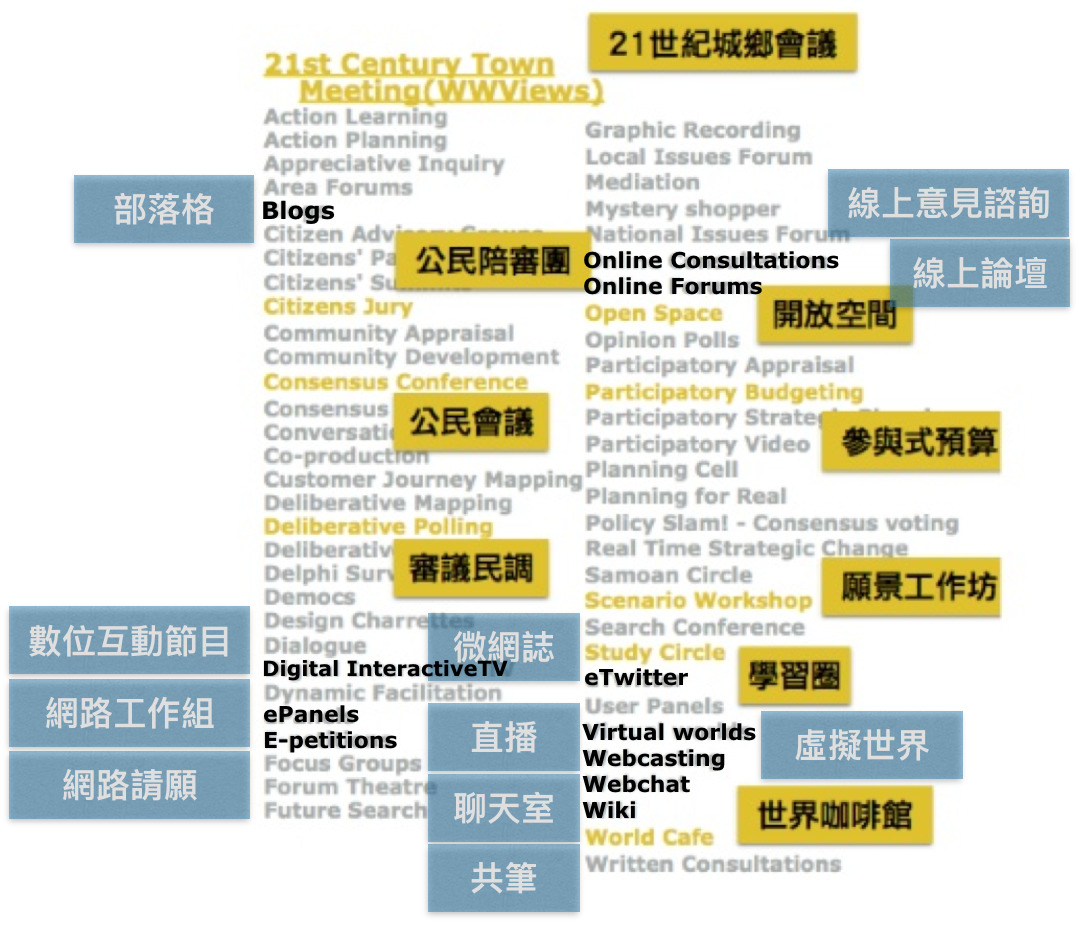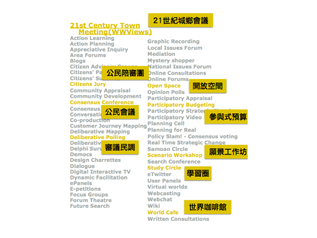 • 解法:那60+種審議操作方式,搞不好可以整理出一張分布圖,說明哪些方式適合在政策形成過程中的哪個階段使用,如果可以有各操作方式的適應症跟不適應症的話,應該會讓外行人好理解很多(也方便用圖來打臉政府的KPI)