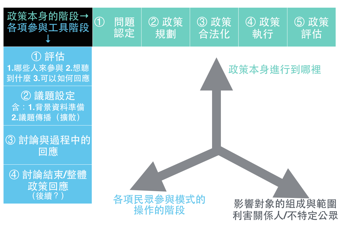ET Blue上面國發會的那張圖的參與工具階段是:評估、議題設定、討論與過程中的回應、討論結束/整政策回應,可以說是下面這張圖的精簡版嗎?還是說上面分成四階段的是針對國發會的狀況、下面分成八階段的是一般通用的狀況?