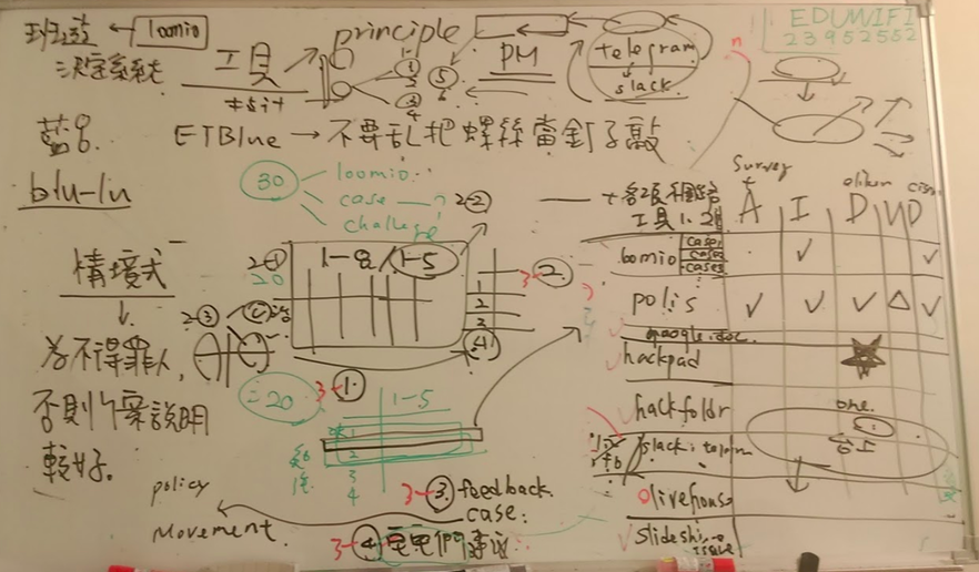 Pomin WuETBlue 前面說 polis 屬發散,loomio 屬收斂,還有loomio不太適合處理scope大的議題,蠻有用的。另一個可以補充的或許是一些 pattern,哪些工具/技術適合接在哪些的前面與後面(例如 vtaiwan 前面接 pol.is 後面接工作組)