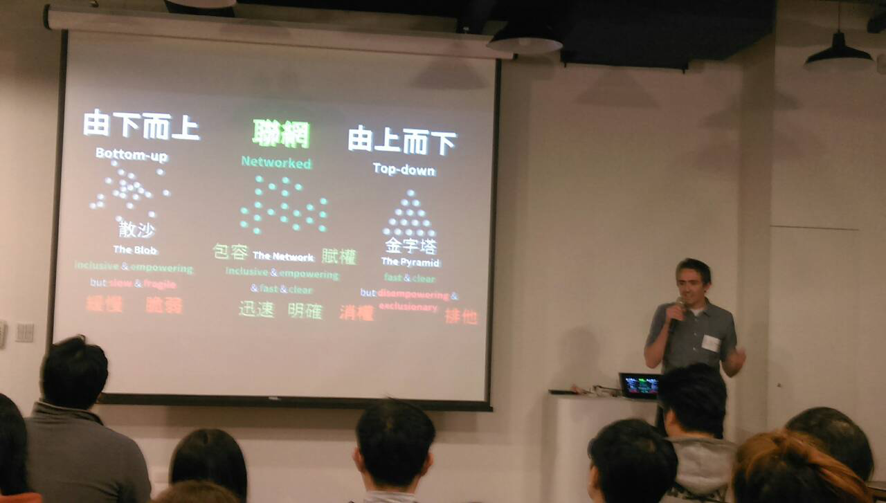 這件事可能對數以百計的世界上的人來說,我們很難讓討論規模成長,總是有人們會被關在圈圈之外,而有些人會取得比其他人更多的話語權。如果你看不到這些潛在的權力狀態,可能是不會發現這個結構的。由下而上的發展是包容的,但是脆弱的,做決策也緩慢;由上而下有效率,但同時排除他人參與。我們有沒有第三種可能?我們現在有網路,我們可以不用把人拒於人外,同樣可以達到有效率的參與。