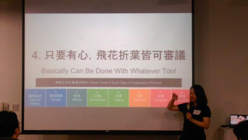 The first level “Presenting Information” is best suited for informatics. When I attended a deliberation facilitated by Chiahua four years ago, topics were collected in a paper manual sent to my home; as new information arrived, they printed replacement pages on-site as hand-outs, so in the end there were stacks of messy papers. Nowadays, Chiahua’s deliberations almost always featured hackpad and hackfoldr, which can be updated at any time, and make things a lot easier than before.