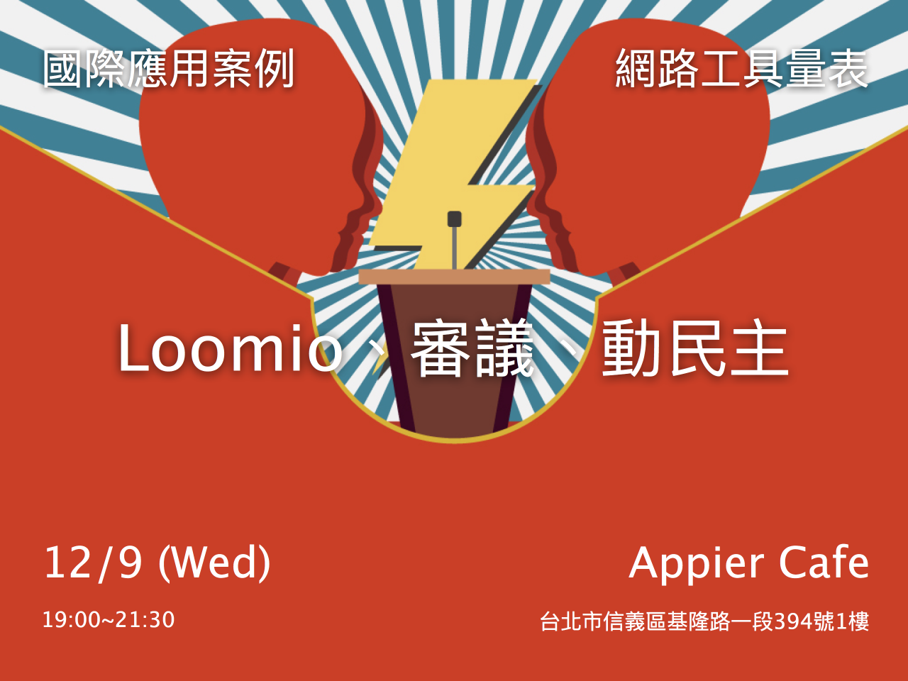 POREN CClkao: Welcome to our event. I'm today's host, CLKao. Since some of our friends in Loomio passed by Asia, we invited them here in Taiwan today, to discuss diliberation with us.